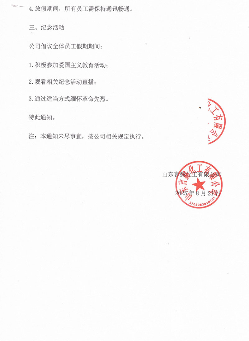 為紀(jì)念中國(guó)人民抗日戰(zhàn)爭(zhēng)暨世界反法西斯戰(zhàn)爭(zhēng)勝利80周年,根據(jù)國(guó)務(wù)院相關(guān)通知精神,結(jié)合公司實(shí)際情況,現(xiàn)將放假安排通知如下: